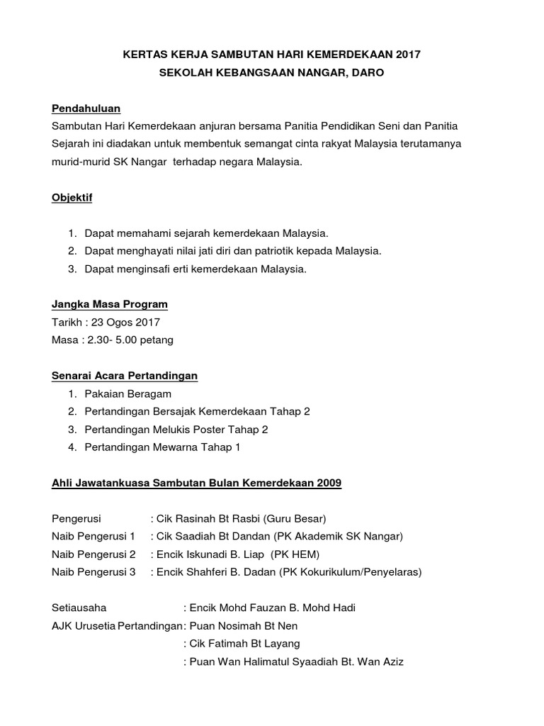 Kertas Kerja Sambutan Hari Kemerdekaan Peringkat Sekolah 2017 Edit Tentatif