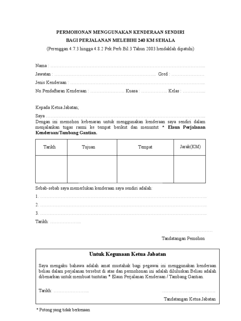 Borang Permohonan Membawa Kenderaan Sendiri 240km Sehala Doc