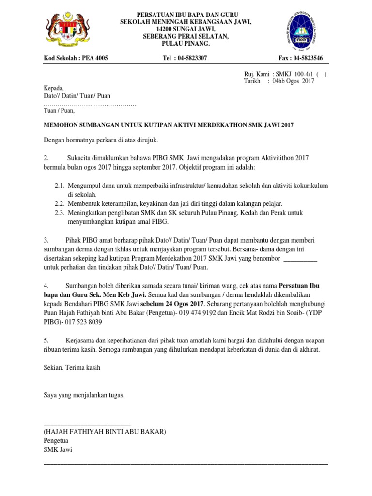 Surat Rasmi Memohon Sumbangan Derma Rasmi H